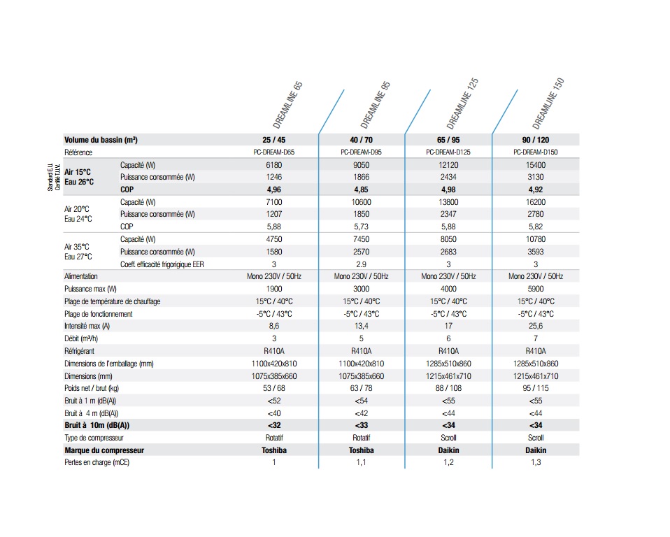 La gamme de pompes à chaleur Dreamline est équipée des meilleurs compresseurs rotatifs au monde en terme de performance et de fiabilité. Son échangeur en titane avec membrane antigel brevetée et sa large surface d’évaporation en aluminium hydrophile vous garantissent une durée de vie inégalée même lors de basses températures. Le COP de nos pompes est le plus élevé du marché européen vous permettant d’économiser jusqu’à 80% par rapport au coût d’un système de chauffage classique.